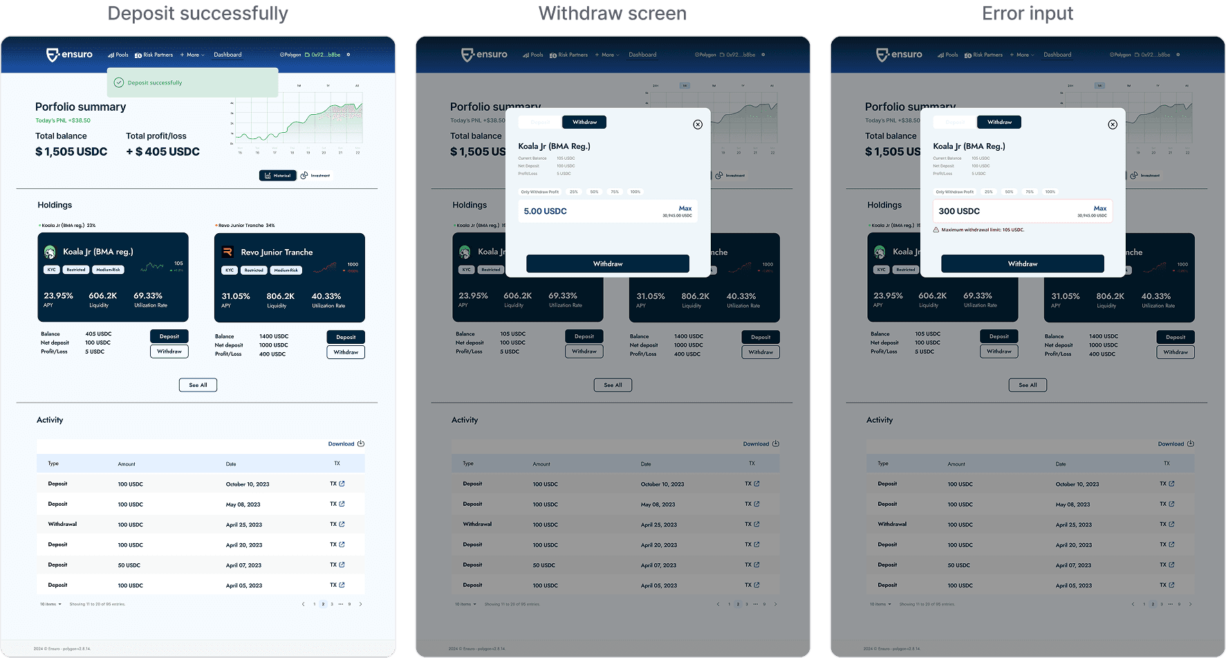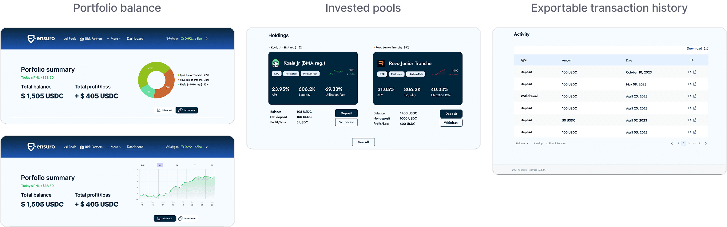 A centralized dashboard giving investors a real-time view of portfolio balance, invested pools, and transaction history, with direct deposit and withdrawal access and exportable reports.