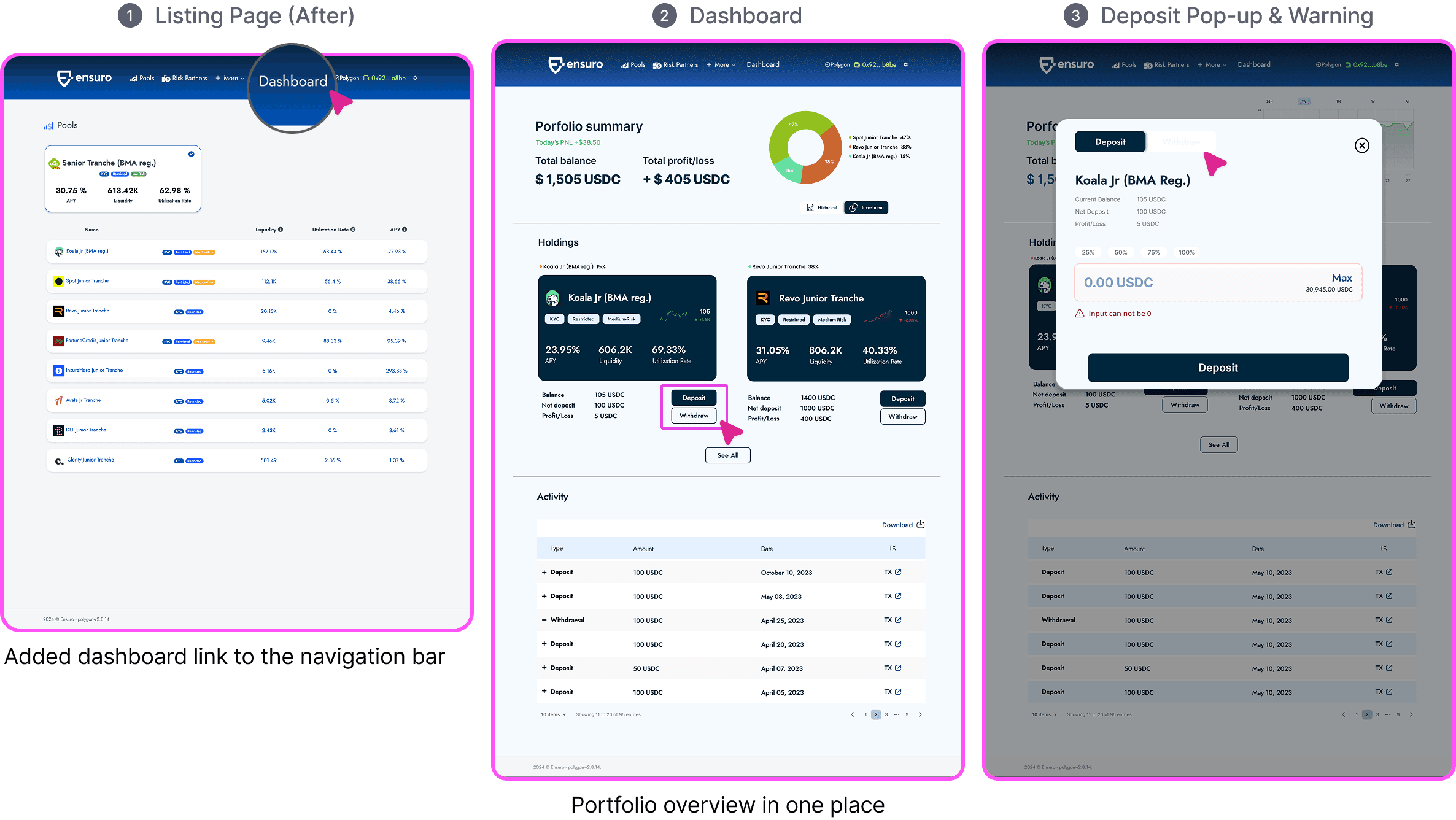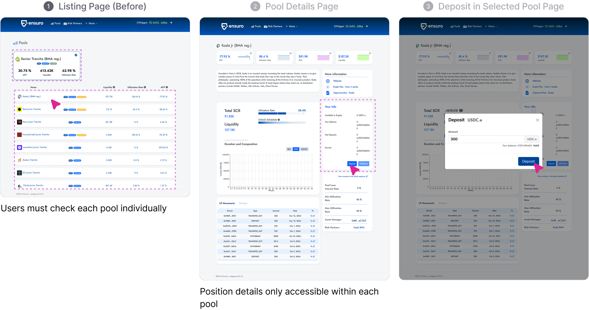 The original flow required navigating through individual pool pages to check balances or deposit. The dashboard consolidates both actions into a single entry point.