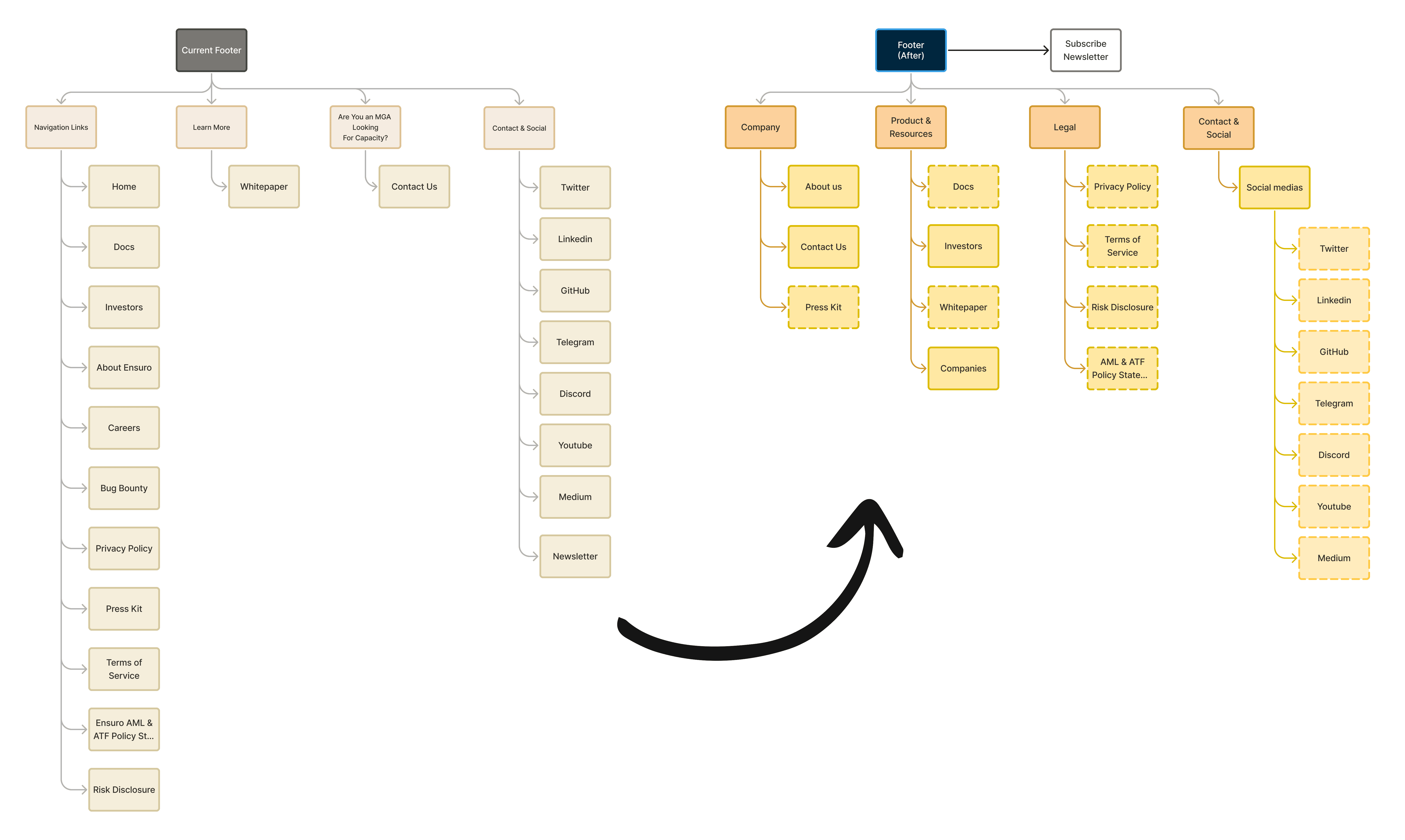 After: Organized into 4 logical categories: Company, Product & Resources, Legal, and Contact & Social